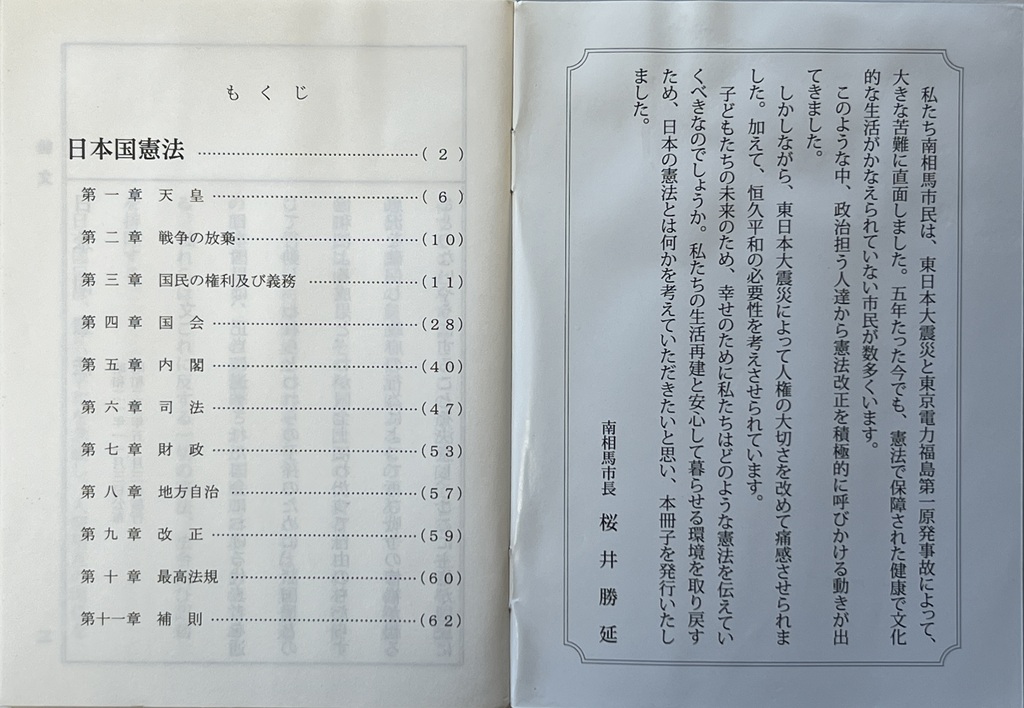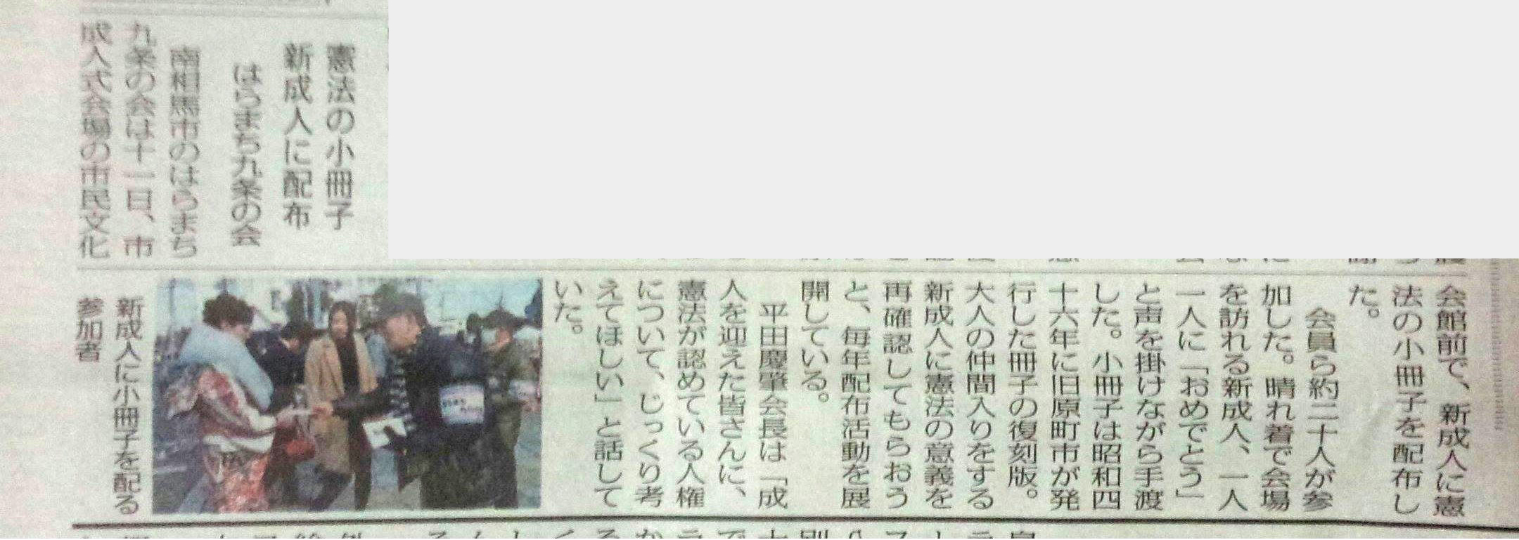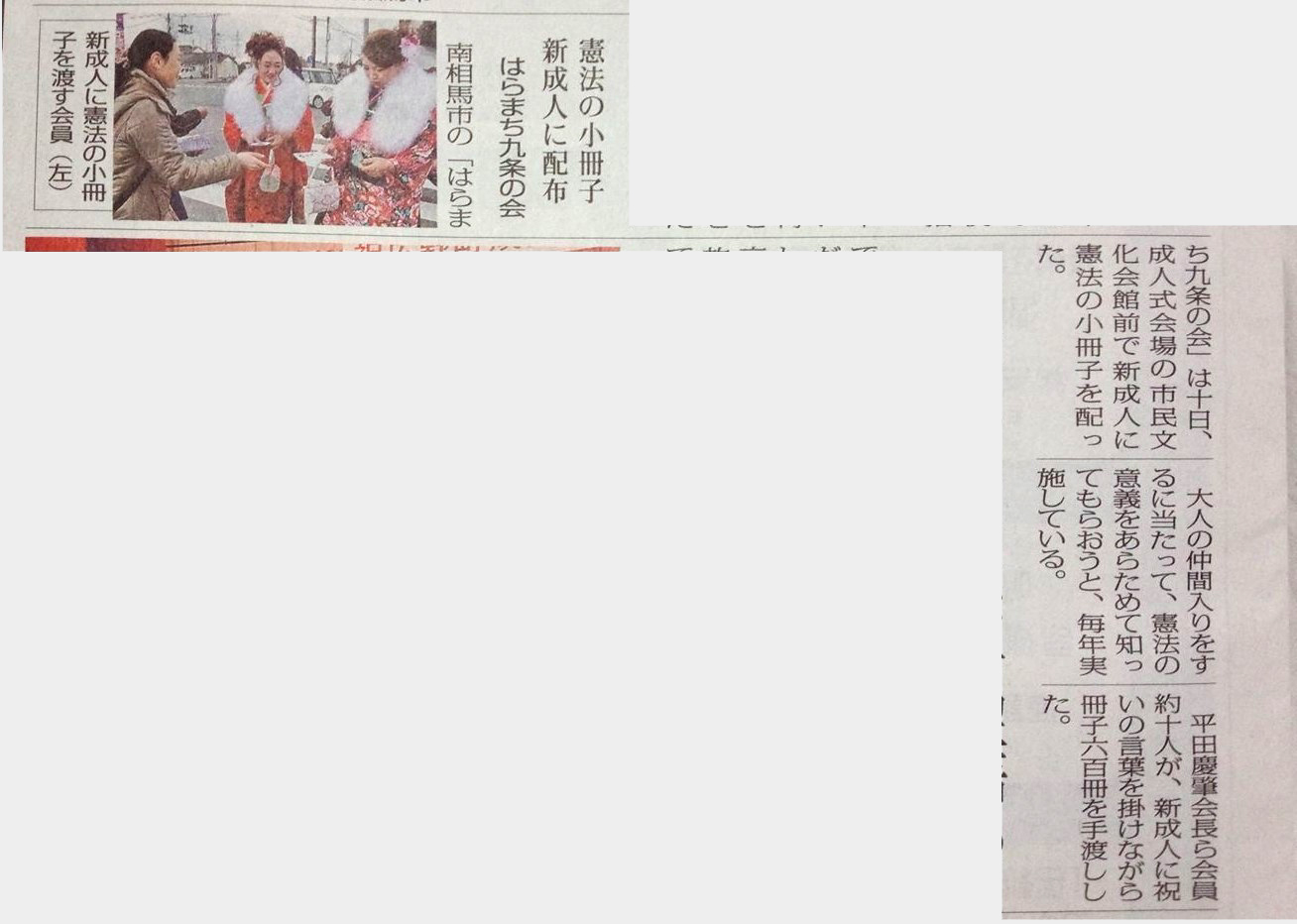 2015年2月16日、会員である小川尚一市議会議員の協力を得て、南相馬市議会に対し、憲法小冊子を再び発行し、市内すべての家庭に配布してほしいという陳情を行いました。話し合いの結果、この陳情は市議会で採択され、2016年5月1日、市内約23,000戸に憲法小冊子が配布されました。