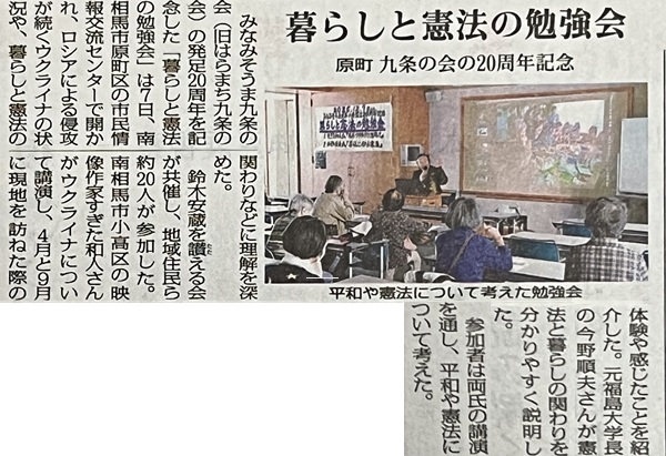 みなみそうま九条の会(旧はらまち九条の会)発足20周年を記念した勉強会を開催しました。