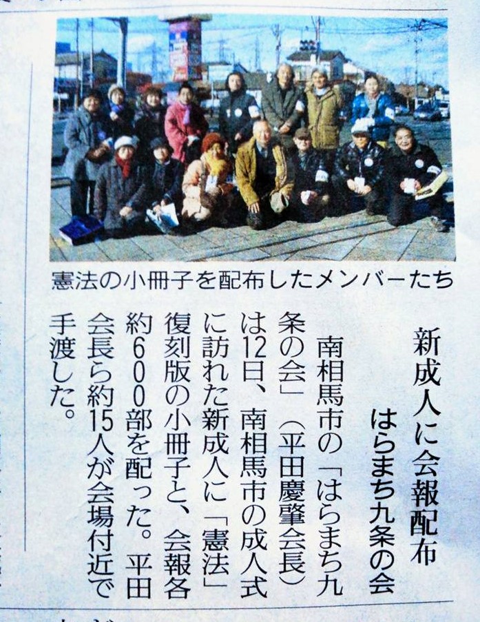 2015年2月16日、会員である小川尚一市議会議員の協力を得て、南相馬市議会に対し、憲法小冊子を再び発行し、市内すべての家庭に配布してほしいという陳情を行いました。話し合いの結果、この陳情は市議会で採択され、2016年5月1日、市内約23,000戸に憲法小冊子が配布されました。